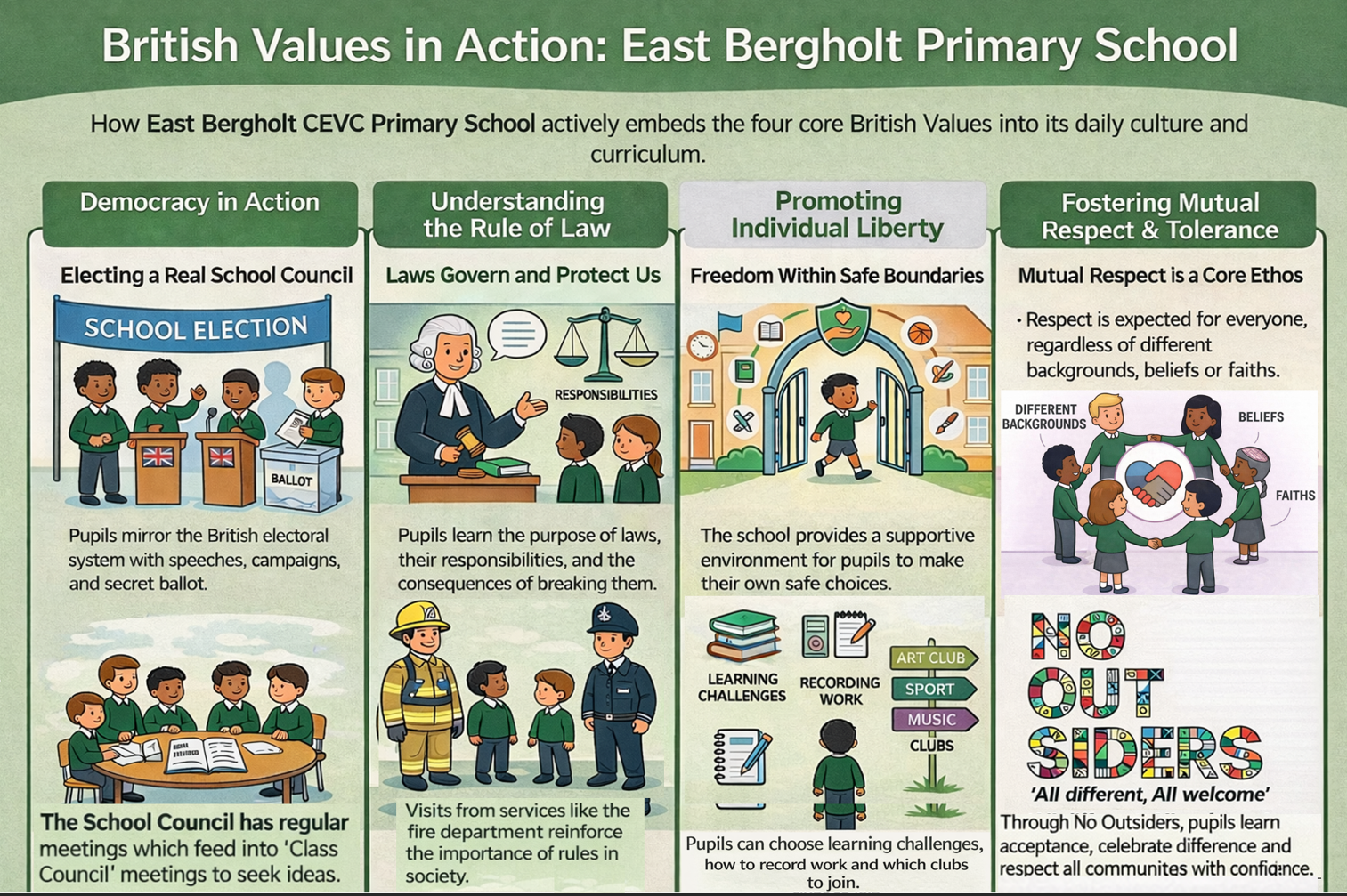 At East Bergholt Primary School, we uphold British Values throughout our school curriculum and within our ethos, ensuring that pupils are fully prepared for life in modern Britain. As Lord Nash states, "We want every school to promote the basic British Values of democracy, the rule of law, individual liberty, and mutual respect and tolerance for those of different faiths and beliefs."
