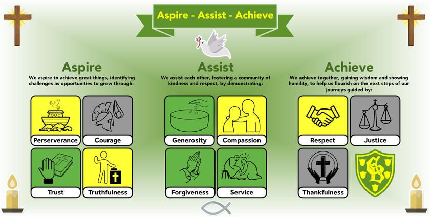 Our school's core Christian values are inspired by our Christian vision and the teachings of John. As a church school, we embrace and explore these values through discussion, prayer and Collective Acts of Worship, which are taught each half-term. These values are integrated into our curriculum and are reflected in our daily conversations with both children and adults. Our children demonstrate these values in their everyday lives, both inside and outside of school. We value all children, regardless of their faith and encourage them to be valuable members of modern society.
